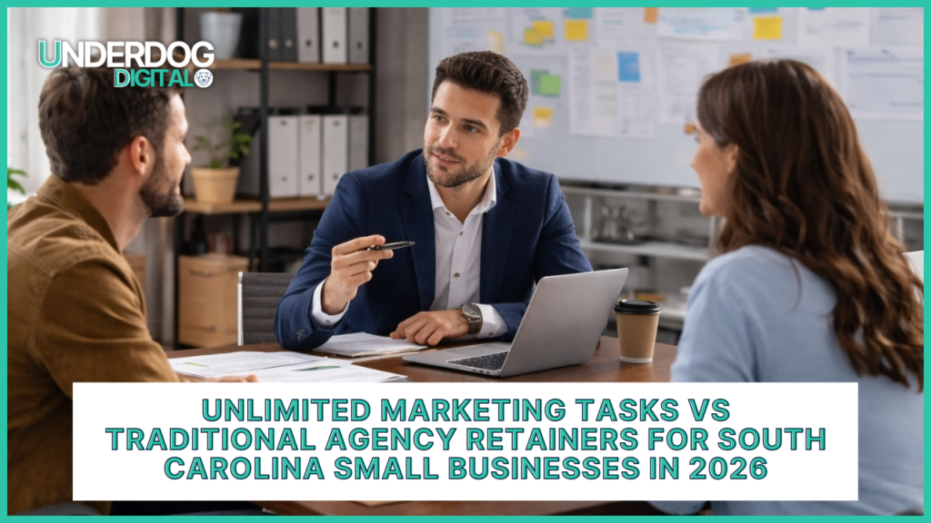 Most small business owners only see three options: hire an agency on retainer, piece together freelancers, or bring on a part-time marketer. Each path has trade-offs in cost, capacity, and how much actually gets done. In this breakdown, we compare those traditional approaches with an unlimited marketing task model, specifically for South Carolina small businesses in 2026. You’ll see how unlimited local marketing services 2026 stack up against retainers, project pricing, and in-house hires across four key areas: budget, output, speed, and risk. By the end, you’ll have a clear framework to decide which model actually fits your goals, your team, and your cash flow. What Are Unlimited Marketing Tasks for Small Businesses? An unlimited marketing model allows you to submit ongoing requests for marketing work each month under one flat monthly fee. Instead of paying hourly or per project, you maintain a steady pipeline of tasks that move forward continuously. Typical requests include: For South Carolina small businesses, an unlimited model means you don’t have to choose between channels. Your HVAC company in Irmo can update the website, improve Google rankings, and run seasonal campaigns at the same time. Traditional Models: Marketing Retainer vs Project Pricing vs Part-Time Hire How does a flat-fee unlimited marketing plan compare to an agency retainer? Most businesses today operate somewhere within a marketing retainer vs project pricing structure, often combined with internal or freelance help. Agency Retainer A traditional retainer gives you a set number of hours or a fixed scope each month. If priorities change, you may need a new contract or additional fees. Work outside the agreed scope often moves slowly or gets billed separately. Project-Based Pricing Project pricing works well for one-time needs like a website redesign or brand refresh. The downside is inconsistency. Marketing stops between projects, which can hurt search rankings, ad performance, and overall visibility. Part-Time In-House Marketer A part-time hire provides internal support but limited bandwidth. One person typically focuses on social media, emails, or basic content, leaving technical SEO, web development, and strategy gaps. Freelancer Patchwork Many owners end up managing multiple freelancers. While this can reduce hourly costs, it often increases management time and creates inconsistencies across messaging, design, and execution. Cost, Capacity, Speed & Risk: Where Unlimited Local Marketing Services 2026 Fit When evaluating unlimited local marketing services 2026, four factors matter most. CostTraditional agencies may charge for strategy, revisions, meetings, and additional scope. If you’re comparing options, review What is the average cost of hiring a marketing agency in 2024? to understand typical ranges. CapacityUnlimited models are built around throughput. Instead of waiting for available hours, your work stays in an active queue. SpeedProject-based and hourly work often pauses when budgets reset. Unlimited models maintain consistent progress, which is critical for SEO and lead generation. RiskStop-start marketing creates performance swings. For budgeting perspective, see What marketing can you actually afford as a small business in 2026? and consider the cost of inconsistency, not just the monthly fee. Is Unlimited Marketing Cheaper Than Hiring a Part-Time Marketer in 2026? Is unlimited marketing cheaper than hiring a part-time marketer in 2026? In many cases, yes. A part-time marketer in South Carolina typically costs $1,500 to $3,000 per month after wages, taxes, tools, and management time. That investment provides limited hours and a single skill set. Unlimited services often fall within the same range but provide access to designers, developers, SEO specialists, and strategists. For businesses looking for affordable marketing for South Carolina small businesses, the real comparison is output per dollar, not just salary. When Should a South Carolina Small Business Switch to Unlimited Support? It usually makes sense when: This shift is common across industries: How to Choose the Right Model for Your SC Small Business in 2026 Choose project-based work if you only need a one-time website or rebrand. Choose a part-time hire if you need someone physically in the office handling internal tasks or events. Choose a traditional retainer if you want a defined scope and long-term strategic relationship with limited flexibility. Choose unlimited support if you need ongoing execution across multiple channels and want predictable monthly output without managing multiple vendors. In 2026, the businesses that grow are the ones that keep marketing moving every month. Get Consistent Marketing Without the Stop-Start (Talk with Underdog Digital) Choosing between an agency retainer, one-off projects, a part-time marketer, or an unlimited task model isn’t about following a trend. It’s about choosing a system that actually keeps your marketing moving. In 2026, South Carolina small businesses cannot afford gaps between projects, delayed updates, or inconsistent visibility. Growth comes from steady execution, not occasional bursts of activity. If you want predictable costs, ongoing progress, and a full team working behind the scenes without adding headcount, an unlimited model may be the better fit. With Underdog Digital, South Carolina business owners don’t have to juggle freelancers, projects, or part-time help. You get a local team that keeps your marketing moving consistently, without adding headcount. Schedule a consultation with Underdog Digital and get a clear plan built around your goals, your budget, and where you want to grow next.